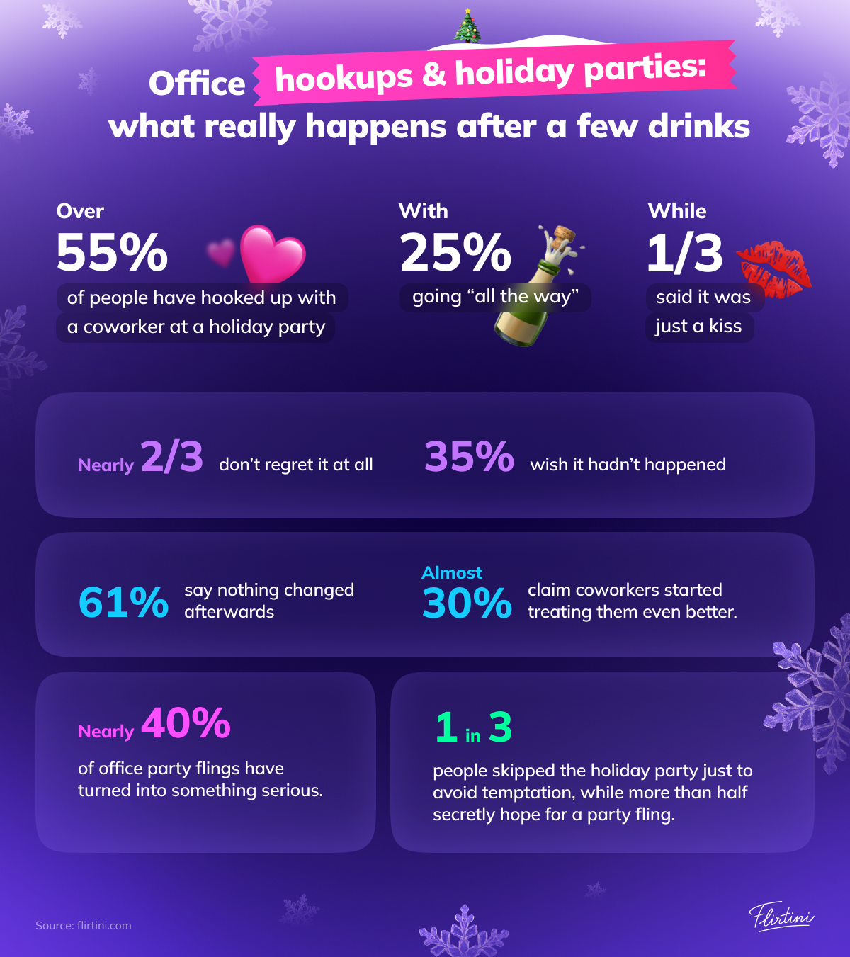 To find out, Flirtini asked users about their experiences with office-party flings, from first kisses to full-on hookups, and whether those moments turned into drama, romance, or… nothing at all.